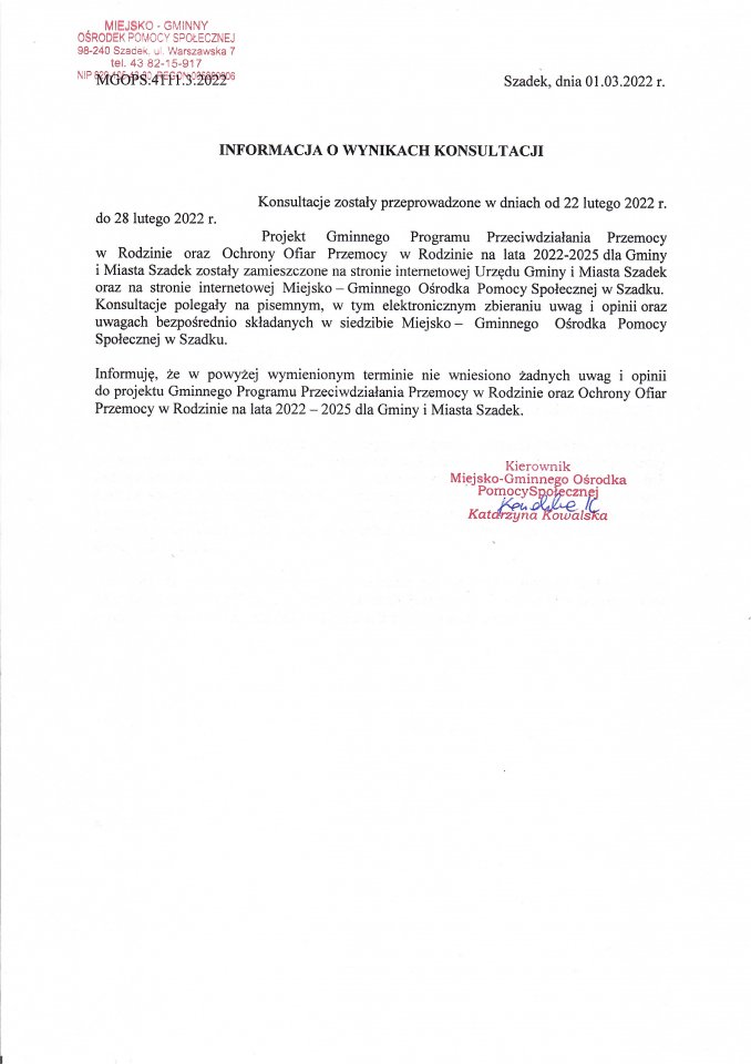 W związku z prowadzonymi przez MGOPS w Szadku pracami nad Gminnym Programem Przeciwdziałania Przemocy oraz Ochrony Ofiar Przemocy w Rodzinie dla Gminy i Miasta Szadek na lata 2022 - 2025 zwracamy się do Państwa z prośbą o zgłaszanie opinii, uwag w zakresie jego tworzenia.